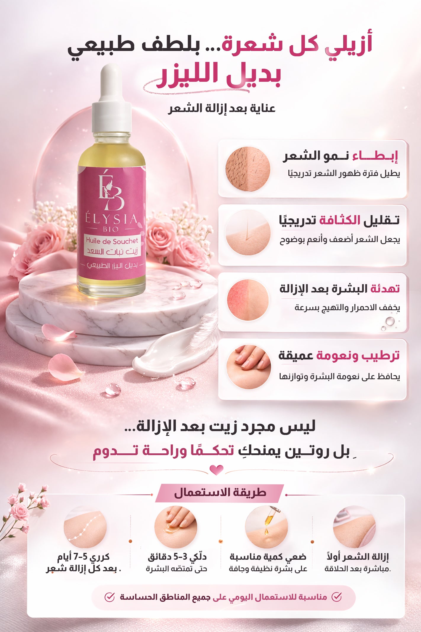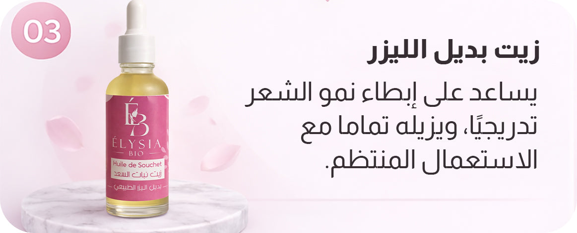 الصابونة تُستعمل مرة يوميًا، الكريمة من 1 إلى 2 مرات يوميًا (يفضّل مساءً)، والزيت يُستعمل يوميًا لمدة 5–7 أيام بعد كل عملية إزالة شعر.
