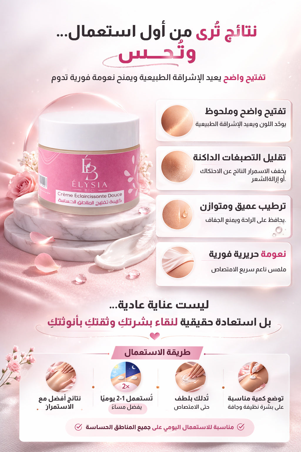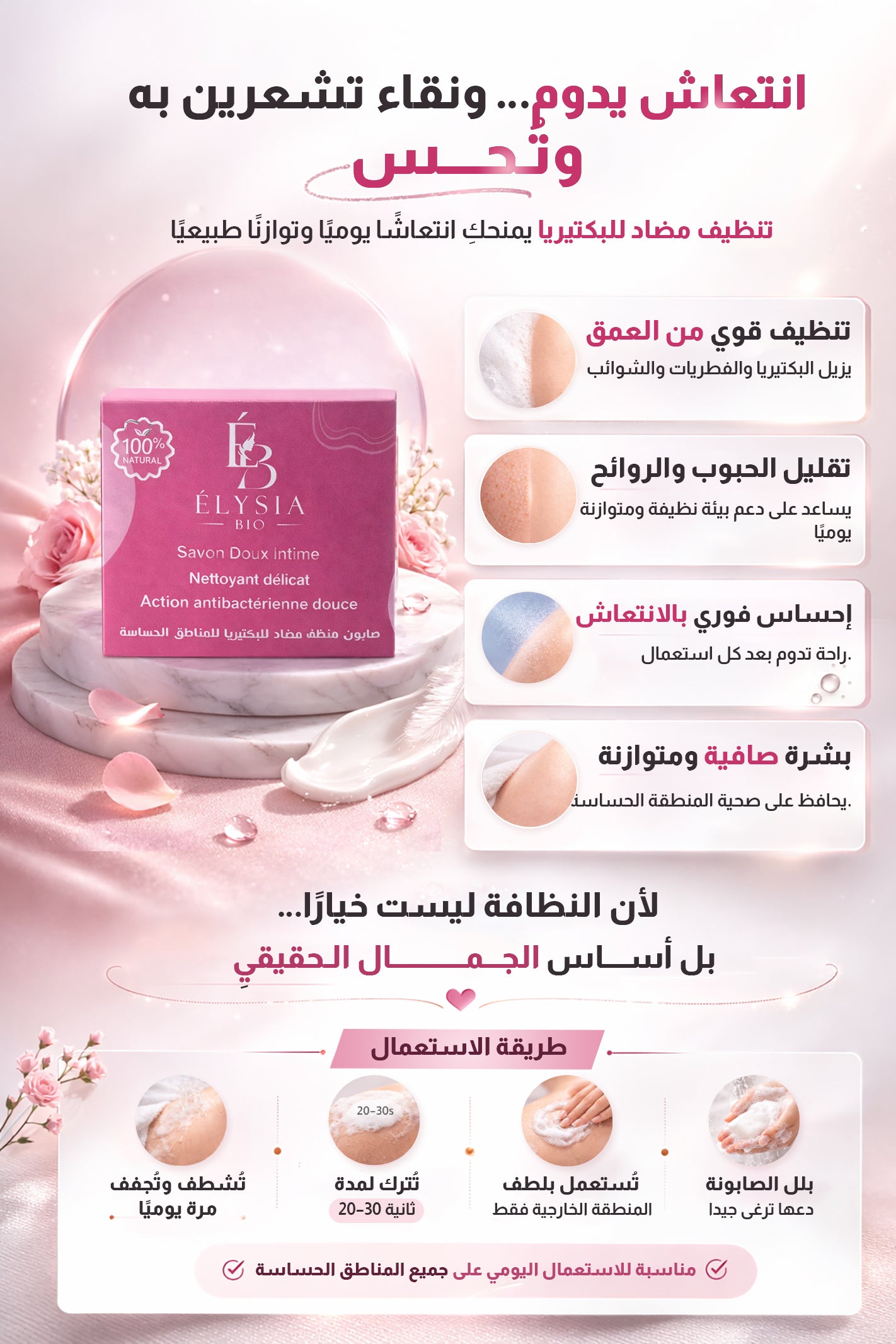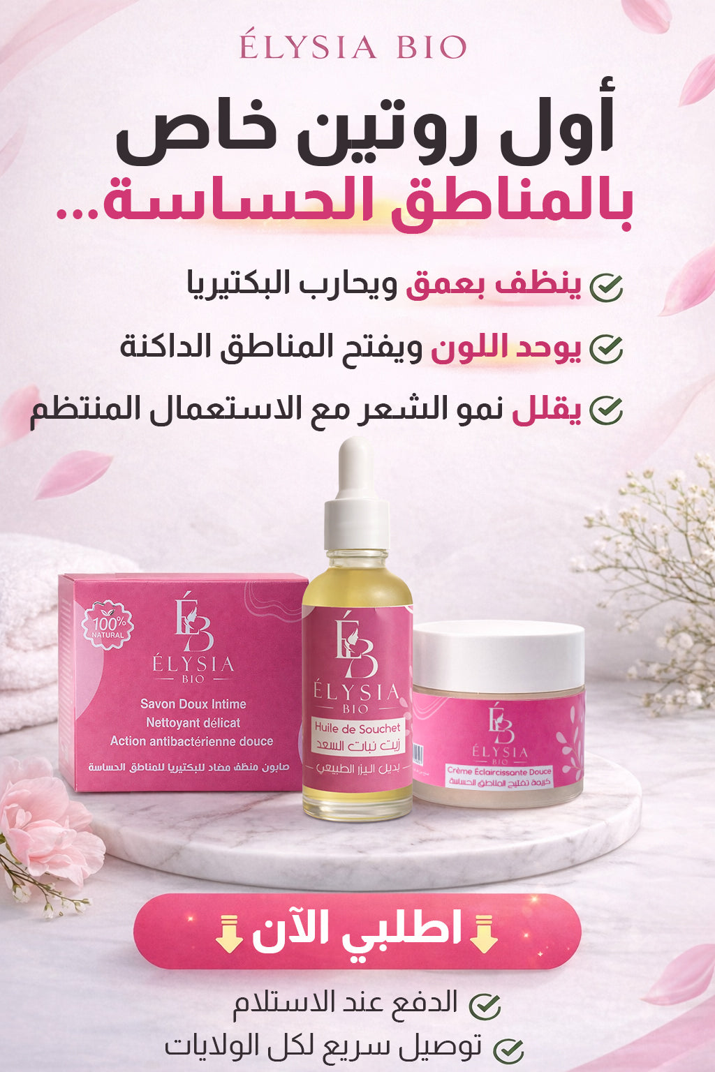 تُستعمل الصابونة أولًا لتنظيف المنطقة الخارجية بلطف، ثم تُوضع الكريمة على بشرة نظيفة وجافة. أمّا الزيت فيُستعمل فقط بعد إزالة الشعر، مع تدليك خفيف حتى الامتصاص.